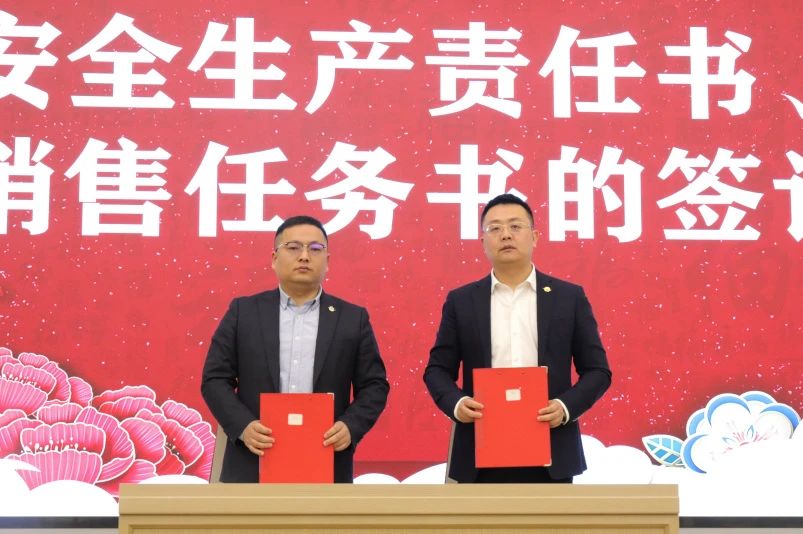 销售副总沈国荣、生产厂长胡湖、徐庆顺分别与总经理杨总签订2024年度销售任务书、安全生产责任书。